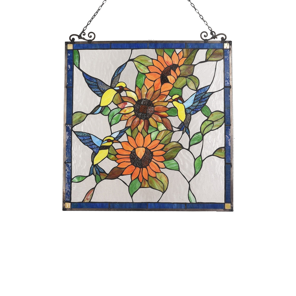 COSTA, an Animal style stained glass window panel features 3 blue and yellow birds, and 3 red-orange sunflowers. This piece is handcrafted from over 235 pieces of hand cut, stained art glass and 3 colorful glass beads, and is sure to bring bright, warm colors into your home. Handcrafted using the same techniques that were developed by Louis Comfort Tiffany in the early 1900s, this beautiful Tiffany-style piece contains hand-cut pieces of stained glass, each wrapped in fine copper foil.