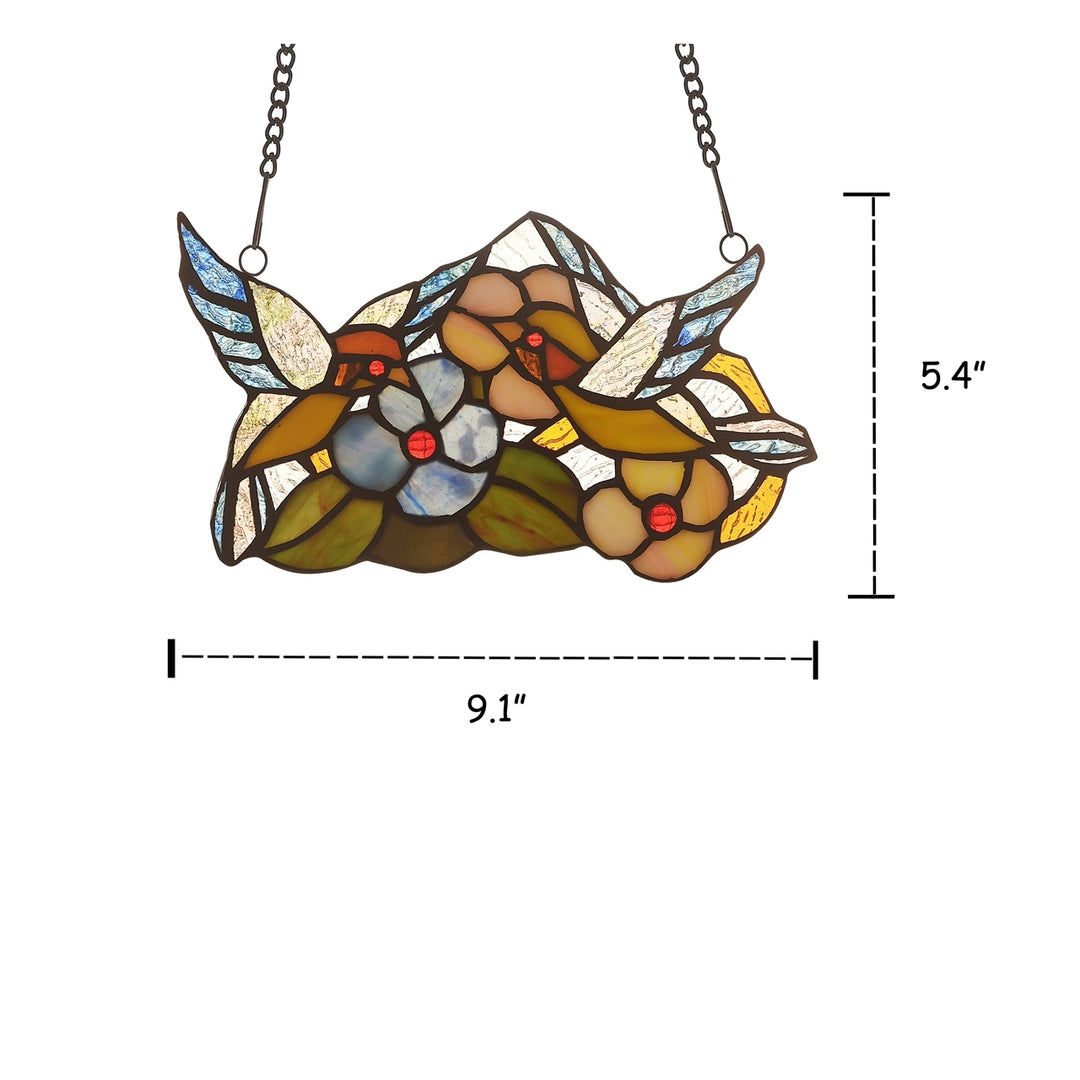 THRUSH, an Animal style stained glass window panel features 2 little birds, flying around a patch of flowers; colors consisting of bright blue and yellow. This piece is hand crafted from over 65 pieces of hand cut, stained art glass and 4 colorful glass beads. Handcrafted using the same techniques that were developed by Louis Comfort Tiffany in the early 1900s, this beautiful Tiffany-style piece contains hand-cut pieces of stained glass, each wrapped in fine copper foil.