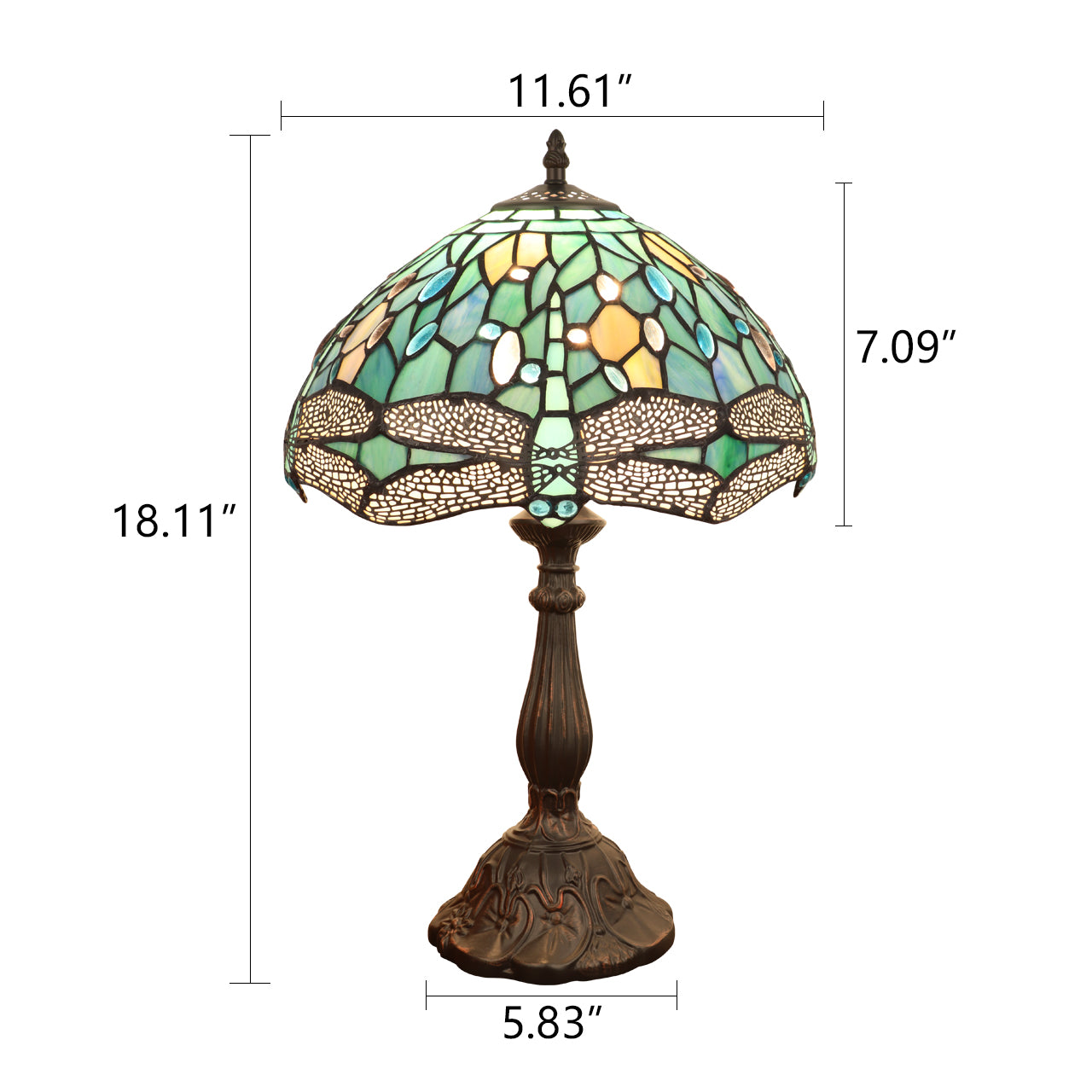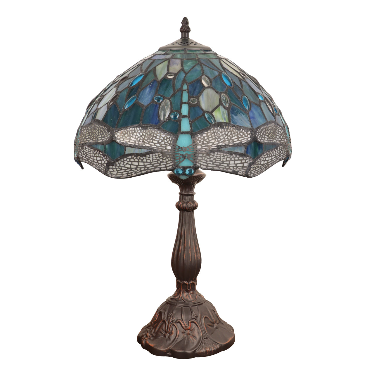 Sunniva is a pleasing, stained glass table lamp in a traditional Dragonfly style, featuring a detailed base and an on-cord rotary switch. This lamp would be perfect in a bedroom, living room, and dining room. The shade is hand-crafted, using the same methods developed by Louis Comfort Tiffany in the early 1900s. This process entails using 265 hand-cut stained art glass pieces and 60 glass beads, each wrapped in fine copper foil and soldered together at extremely high temperatures to form each unique piece. The exact size to the nearest inch may vary, and the exact color of each glass piece may vary due to each piece being hand-crafted. The first image is with the light shining through, and the second image is with no light. Dry-listed and recommended for an indoor setting.