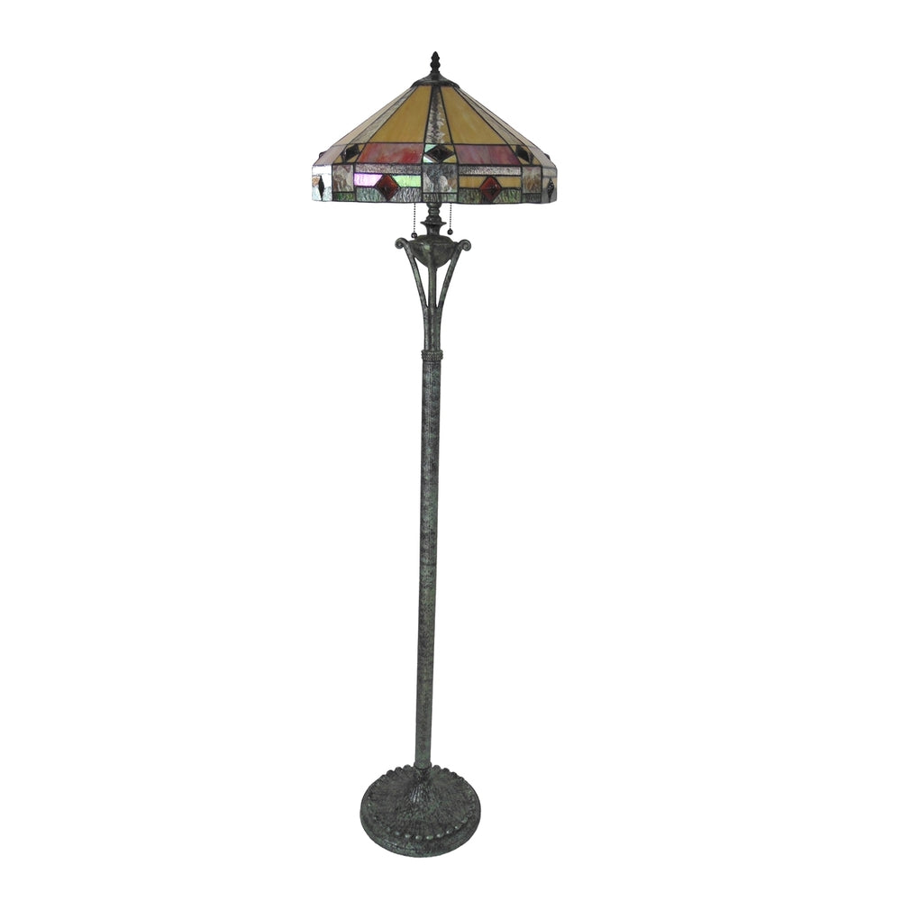 This Tiffany-style Mission design 2-light floor lamp features a textured black/ dark green finish that will complement many decors throughout your home. Handcrafted from individually hand cut of 142 pieces copper-foiled stained glass and 16 stones, each wrapped in a thin copper foil and soldered together, designed in the same style used by Louis Comfort Tiffany in the early 1900's. This piece will add color and beauty to any room.