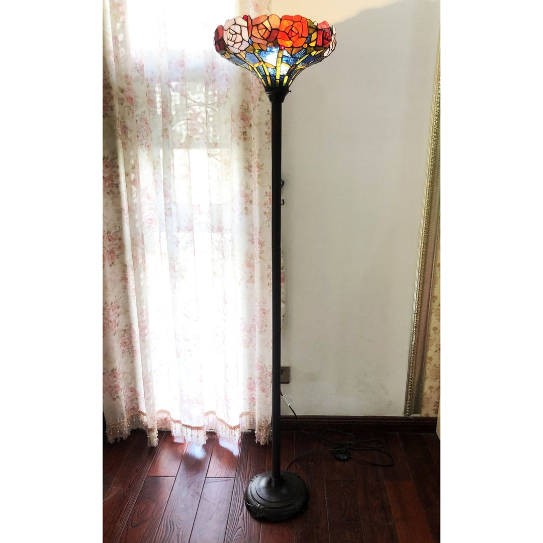 If you're looking for a bit of a color pop in your home, this is the torchiere lamp for you! Featuring a foot switch and an antique bronze, 59" tall base, and a rose styled tiffany shade, made up of 360 pieces of hand cut, stained glass, and 2 glass beads. Each glass piece and glass bead is wrapped in a fine copper foil and soldered together using high heat, to form each unique, beautiful piece. It is hand created using the same technique developed by Louis Comfort Tiffany in the early 1900's. Each piece is unique, and is sure to catch everyone's eye with it's vibrant colors.