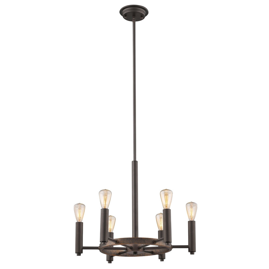 This 6-light chandelier features an oil rubbed bronze and rustic finish that will complement many industrial and transitional decors. The exposed bulbs set atop the frame adds interest while providing ample light to any space.
