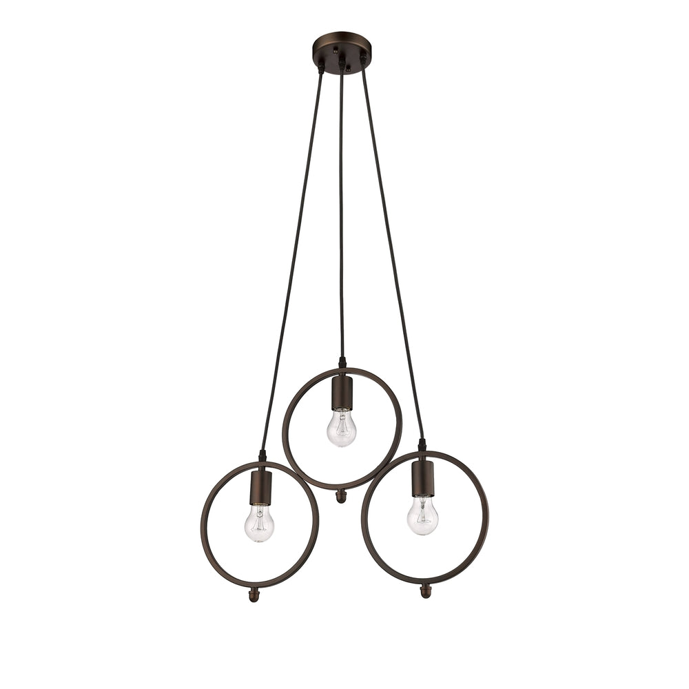 IRONCLAD, an Industrial style 3 light pendant, feaures an oil rubbed bronze finish that will complement many industrial and transitional decors. The clean lines of the circle steel frames add interest, while the exposed bulbs provide ample light to any space.