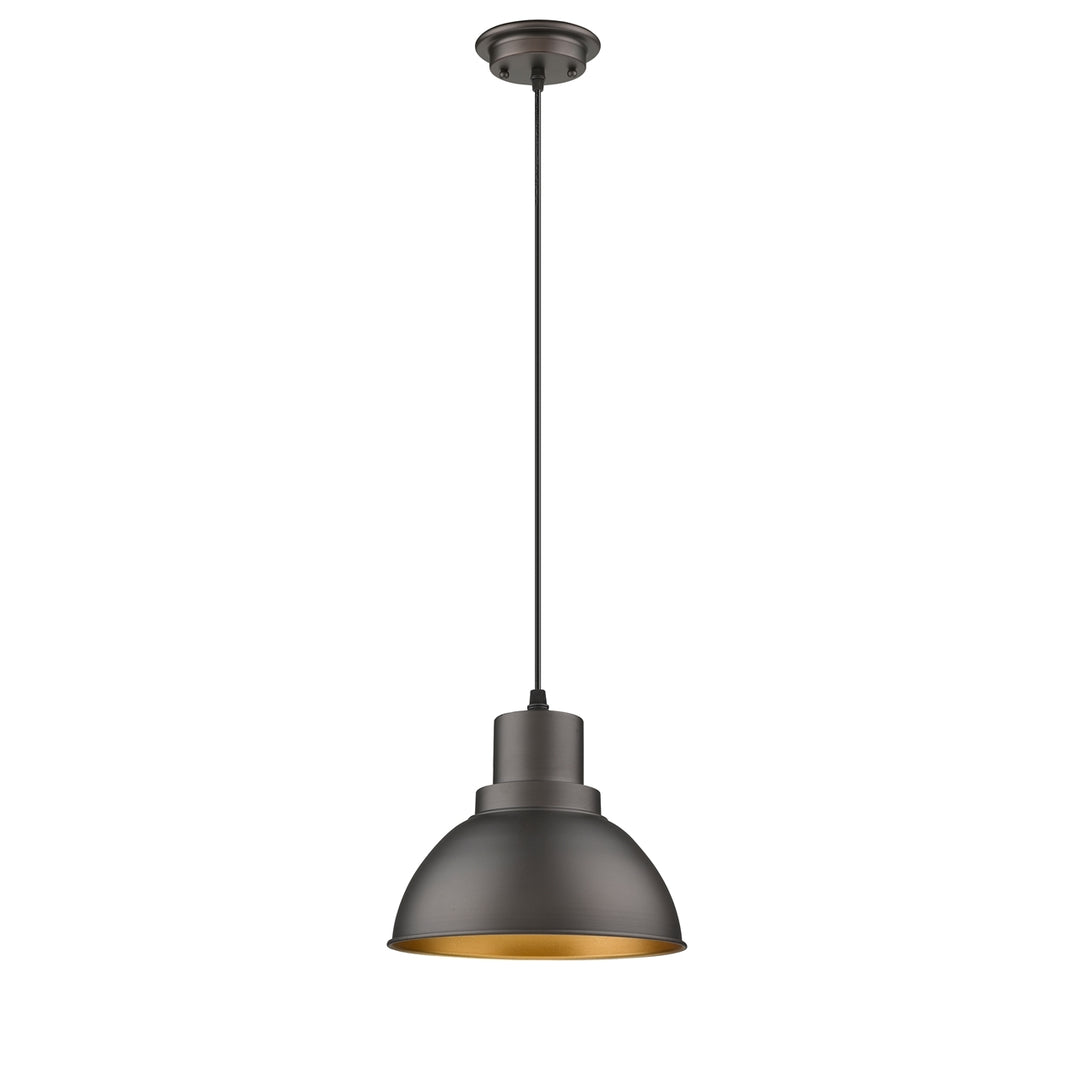 This 1-light pendant features an oil rubbed bronze finish that will complement many industrial and transitional decors. The clean lines of the steel frame and matching metal shade softens the light to create a warm ambiance for any space.