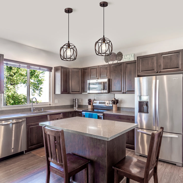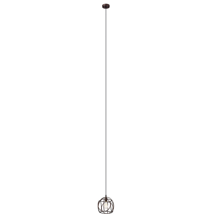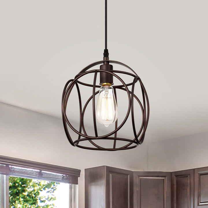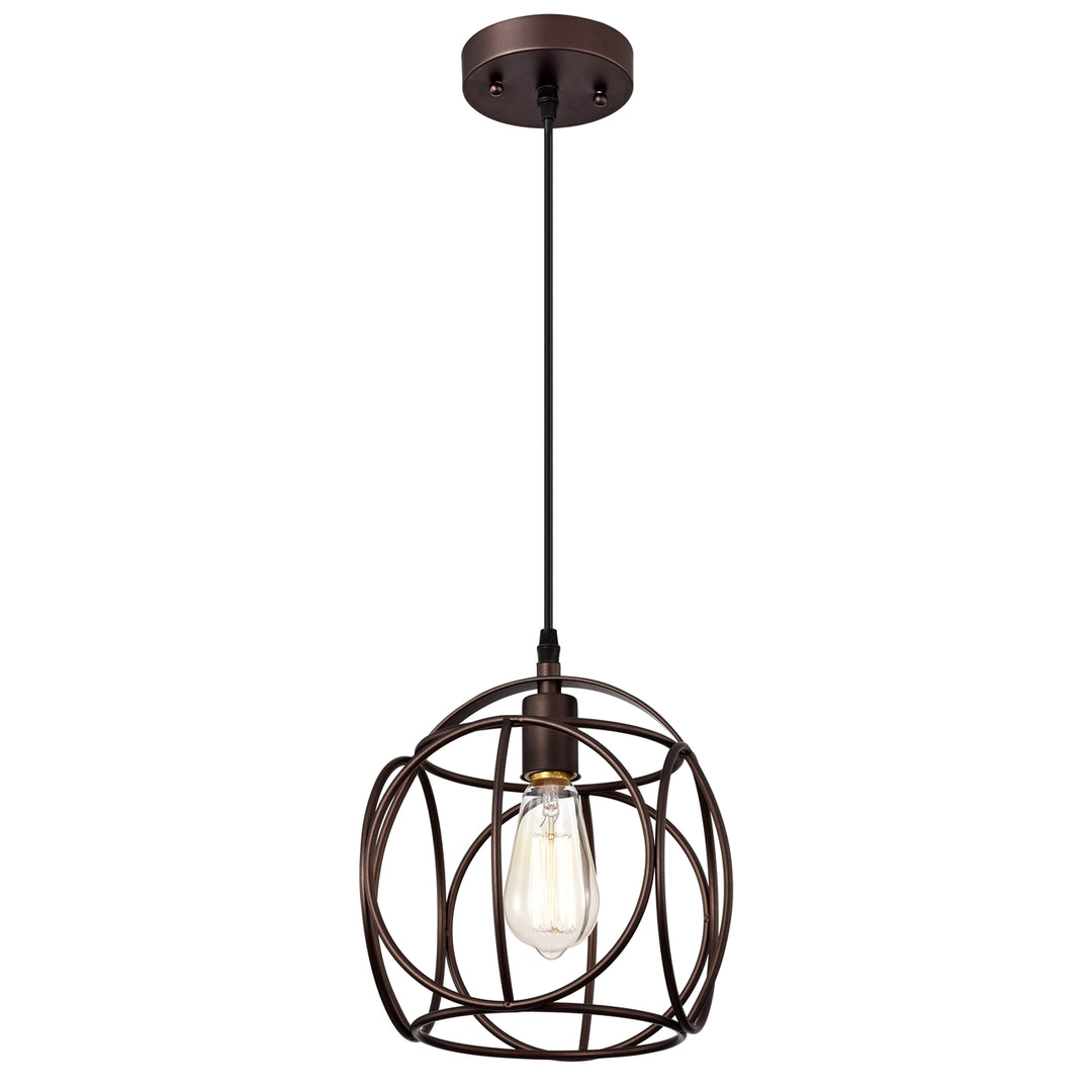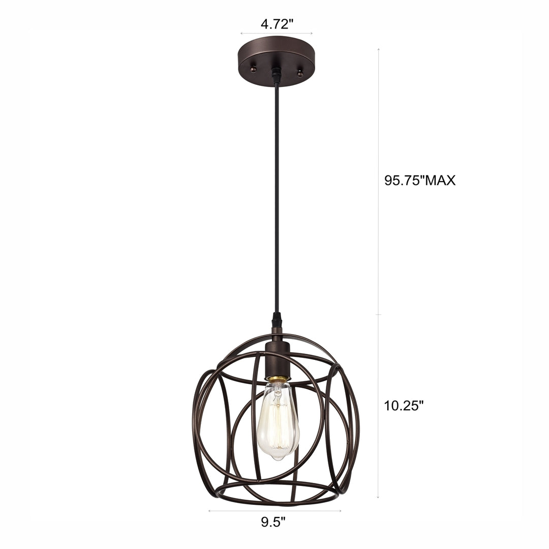Ironclad, a 1-light pendant, features an oil rubbed bronze finish that will complement many industrial decors. The novelty shaped frame provides uninterrupted light to any space. This fixture is downlight direction and takes one 100W E26 bulb, and is compatible with fluorescent, incandescent, and LED bulbs. UL Listed, Dry listed, and recommended for an indoor setting only. Can be installed on a sloped ceiling.