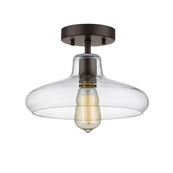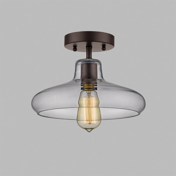 This 1-light semi flush mount features an oil rubbed bronze finish that will complement many loft, urban, industrial, and transitional decors. The unique shape of the clear glass shade adds interest and showcases the old fashioned Edison bulb.
