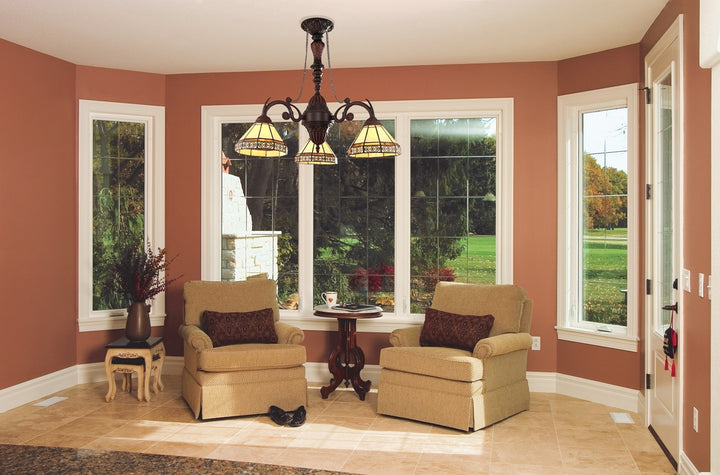 Belle is a beautiful mission-style 3 light chandelier, featuring stained glass that will cast a warm glow for your home. Each shade is made up of 40 pieces of copper-foiled, stained art glass, expertly designed and crafted by hand. Each of CHLOE's Tiffany-style stained glass products is formed using the very same technique developed by Louis Comfort Tiffany in the early 1900's, using hand cut stained art glass, each wrapped in fine copper foil and soldered together at extremely high temperatures to form each unique piece. Exact size to the nearest inch may vary, and exact color of each glass piece may vary due to each piece being handcrafted. First image is with the light shining through, second image is with no light. Dry listed and recommended for an indoor setting.