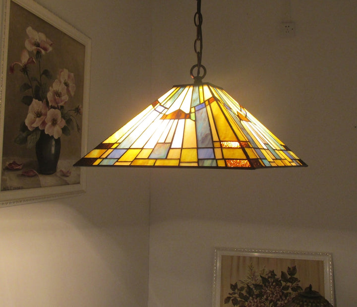KIINSEY, a Mission Tiffany-style 2 light ceiling pendant, is a gorgeous addition to your home with its bright down-to-earth tones. Handcrafted from over 230 pieces of art glass that will add color and beauty to any space. Main colors are green, yellow, and blue. Handcrafted using the same techniques that were developed by Louis Comfort Tiffany in the early 1900s, this beautiful Tiffany-style piece contains hand-cut pieces of stained glass, each wrapped in fine copper foil.