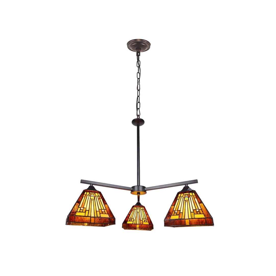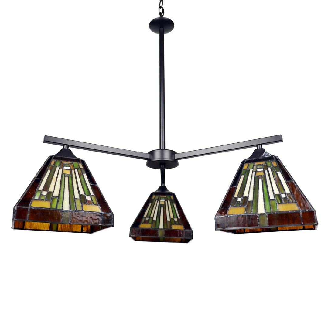 Innes is a beautiful mini chandelier, featuring 3 stained glass mission shades. This chandelier would be perfect to hang over a dining room table or over an entranceway. Each shade is hand crafted, using the same methods developed by Louis Comfort Tiffany in the early 1900's. This process entails using 183 hand cut stained art glass pieces, each wrapped in fine copper foil and soldered together at extremely high temperatures to form each unique piece. Exact size to the nearest inch may vary, and exact color of each glass piece may vary due to each piece being handcrafted. First image is with the light shining through, second image is with no light. Dry listed and recommended for an indoor setting.