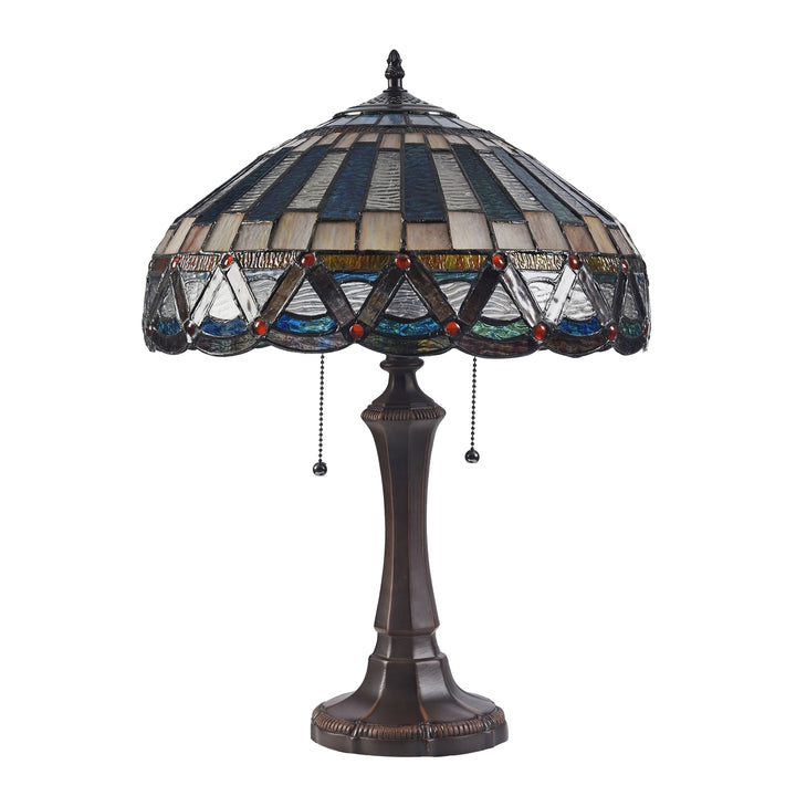 COURTLAND, a Mission style 2 light table lamp, features a stained and hand-cut glass shade that will bring an old-fashioned feel to your home. Hand crafted from over 285 pieces of art glass and 36 glass beads. Main colors are blue and brown. Handcrafted using the same techniques that were developed by Louis Comfort Tiffany in the early 1900s, this beautiful Tiffany-style piece contains hand-cut pieces of stained glass, each wrapped in fine copper foil.
