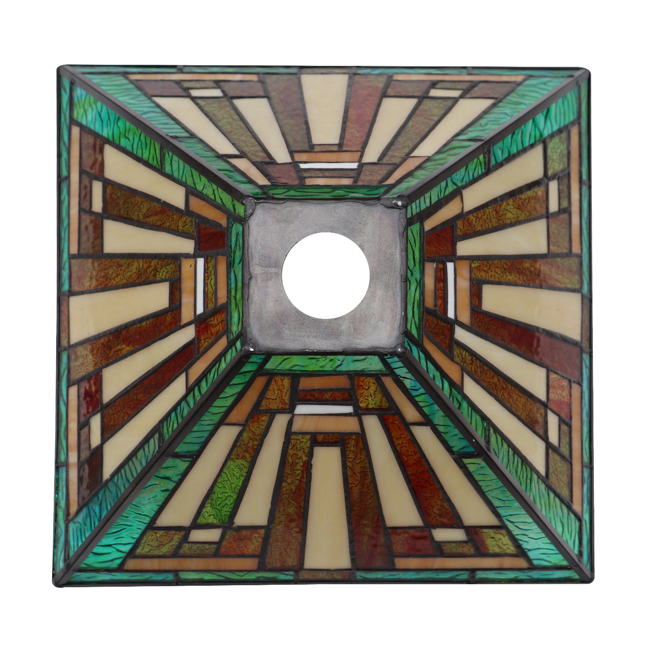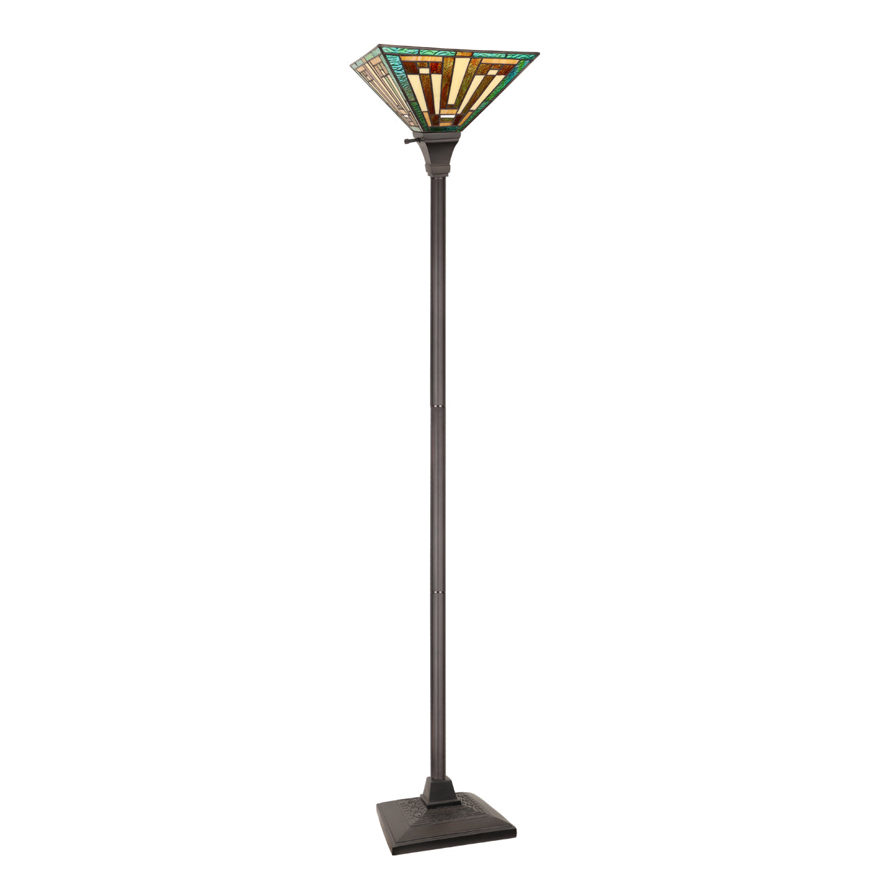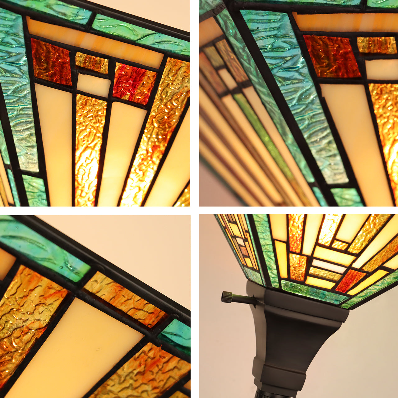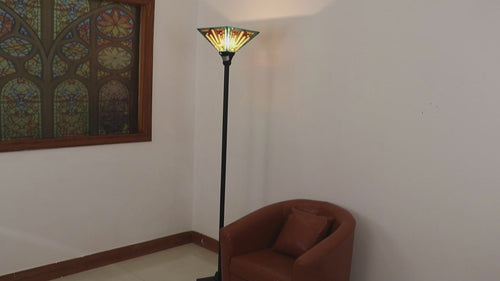 Firman is a beautiful mission-style torchiere floor lamp, featuring stained glass that will cast a warm glow for your home. It is made up of 152 pieces of copper-foiled, stained art glass, expertly designed and crafted by hand. Each of CHLOE's Tiffany-style stained glass products are formed using the very same technique developed by Louis Comfort Tiffany in the early 1900's, using hand cut stained art glass, each wrapped in fine copper foil and soldered together at extremely high temperatures to form each unique piece. Exact size to the nearest inch may vary, and exact color of each glass piece may vary due to each piece being hand crafted. First image is with the light shining through, second image is with no light. Dry listed and recommended for an indoor setting.
