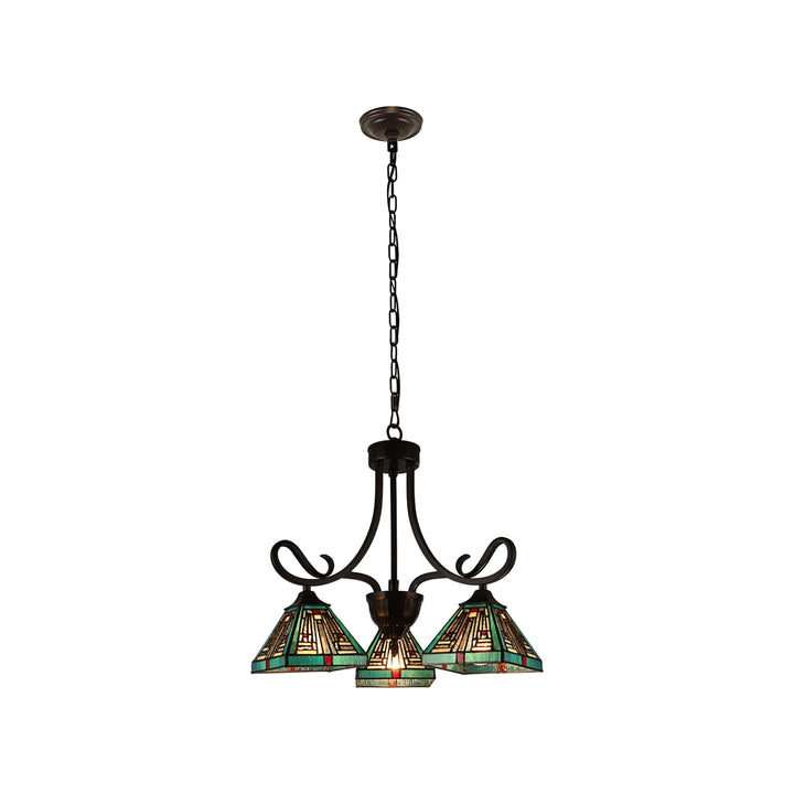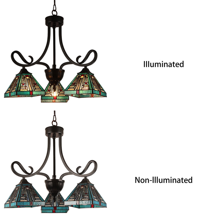 Innes is a beautiful mini chandelier, featuring 3 stained glass mission shades. This chandelier would be perfect to hang over a diningroom table or over an entrance way. Each shade is hand crafted, using the same methods developed by Louis Comfort Tiffany in the early 1900's. This process entails using 480 hand cut stained art glass pieces, each wrapped in fine copper foil and soldered together at extremely high temperatures to form each unique piece. Exact size to the nearest inch may vary, and exact color of each glass piece may vary due to each piece being hand crafted. First image is with the light shining through, second image is with no light. Dry listed and recommended for an indoor setting.