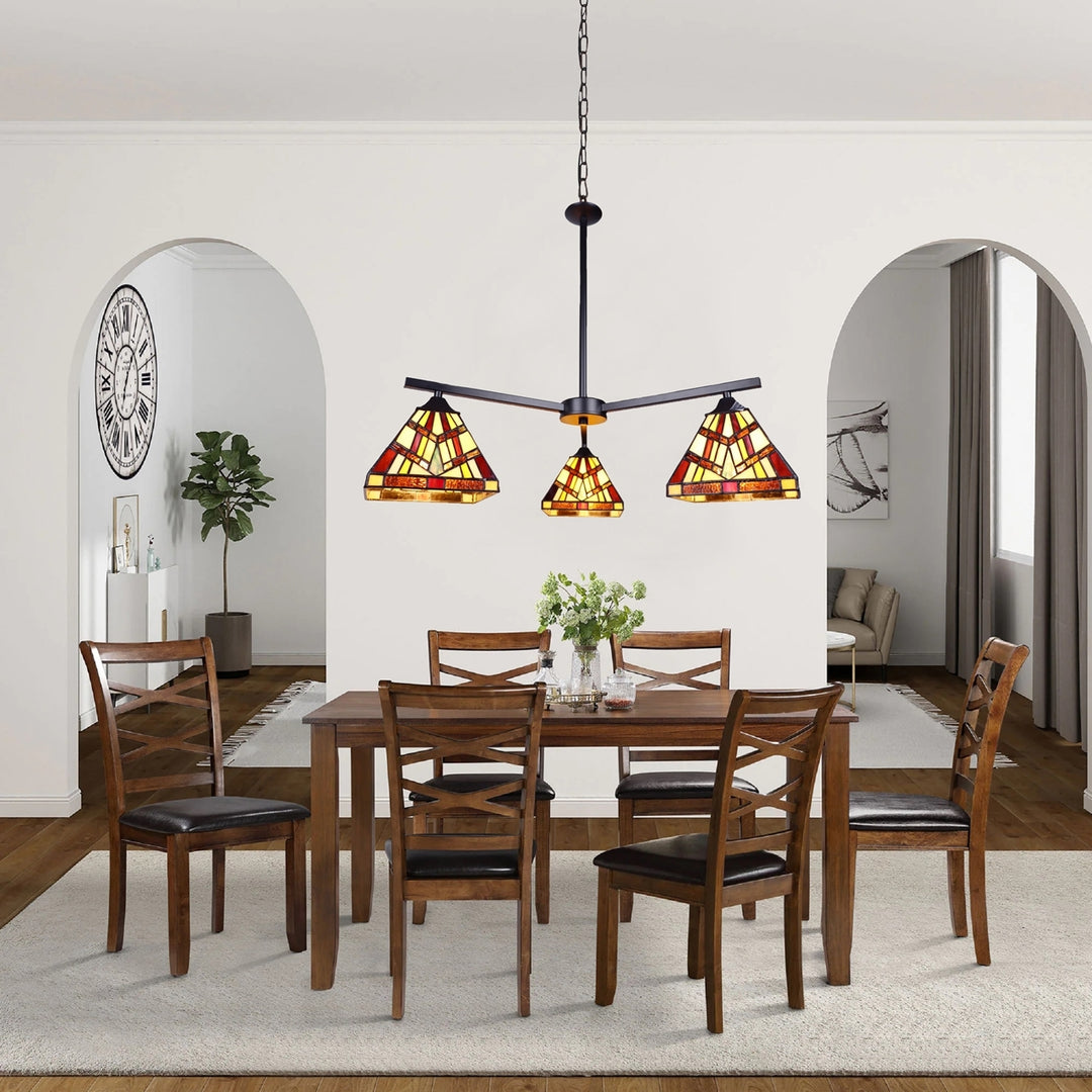 Vincent is a beautiful large chandelier, featuring 5 stained glass mission shades. This chandelier would be perfect to hang over a diningroom table or over an entrance way. Each shade is hand crafted, using the same methods developed by Louis Comfort Tiffany in the early 1900's. This process entails using 492 hand cut stained art glass pieces, each wrapped in fine copper foil and soldered together at extremely high temperatures to form each unique piece. Exact size to the nearest inch may vary, and exact color of each glass piece may vary due to each piece being hand crafted. First image is with the light shining through, second image is with no light. Dry listed and recommended for an indoor setting.