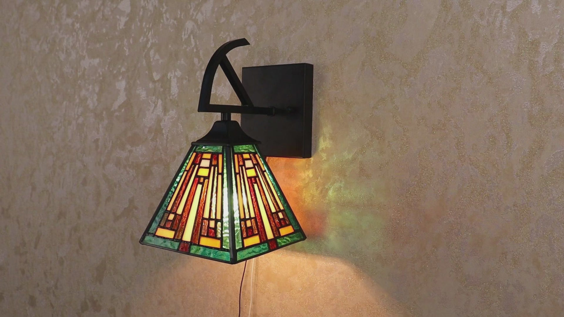 Firman is a charming Mission-style 1 light wall sconce, featuring stained glass that will cast a warm glow on your home. The shade is made up of 132 pieces of copper-foiled, stained art glass, expertly designed and crafted by hand. CHLOE's Tiffany-style stained glass products are formed using the very same technique developed by Louis Comfort Tiffany in the early 1900s, using hand-cut stained art glass, each wrapped in fine copper foil and soldered together at extremely high temperatures to form each unique piece. The exact size to the nearest inch may vary, and the exact color of each glass piece may vary due to each piece being handcrafted. The first image is with the light shining through, the second image is with no light. Dry-listed and recommended for an indoor setting.