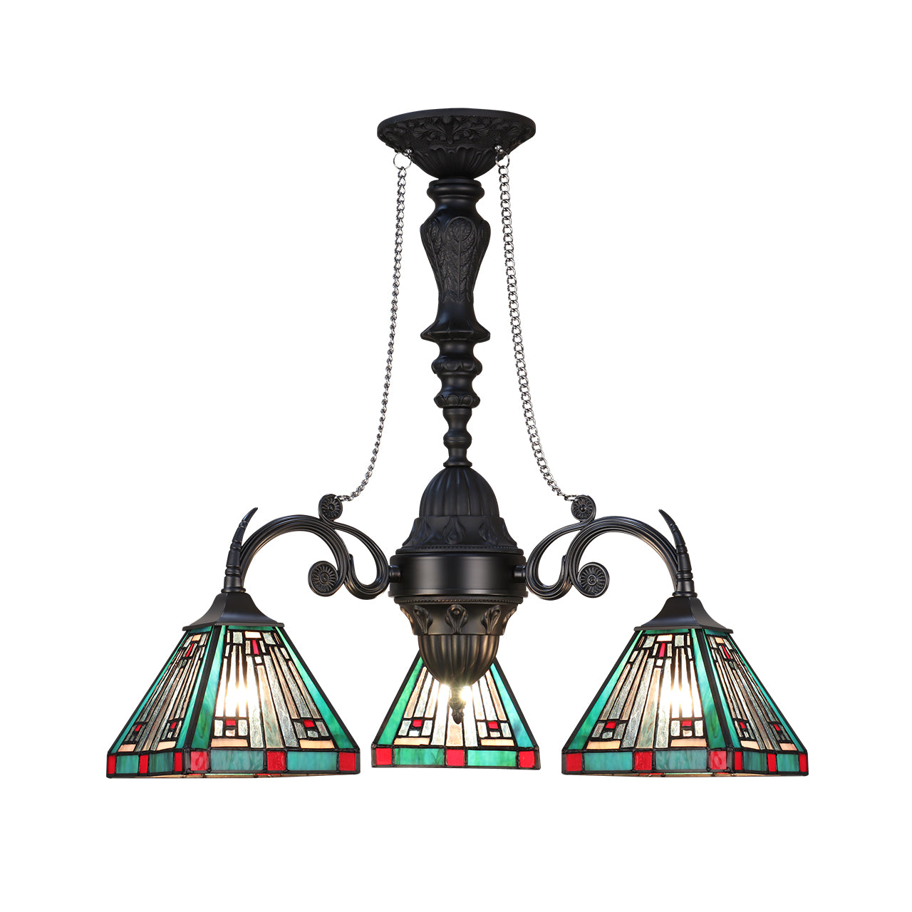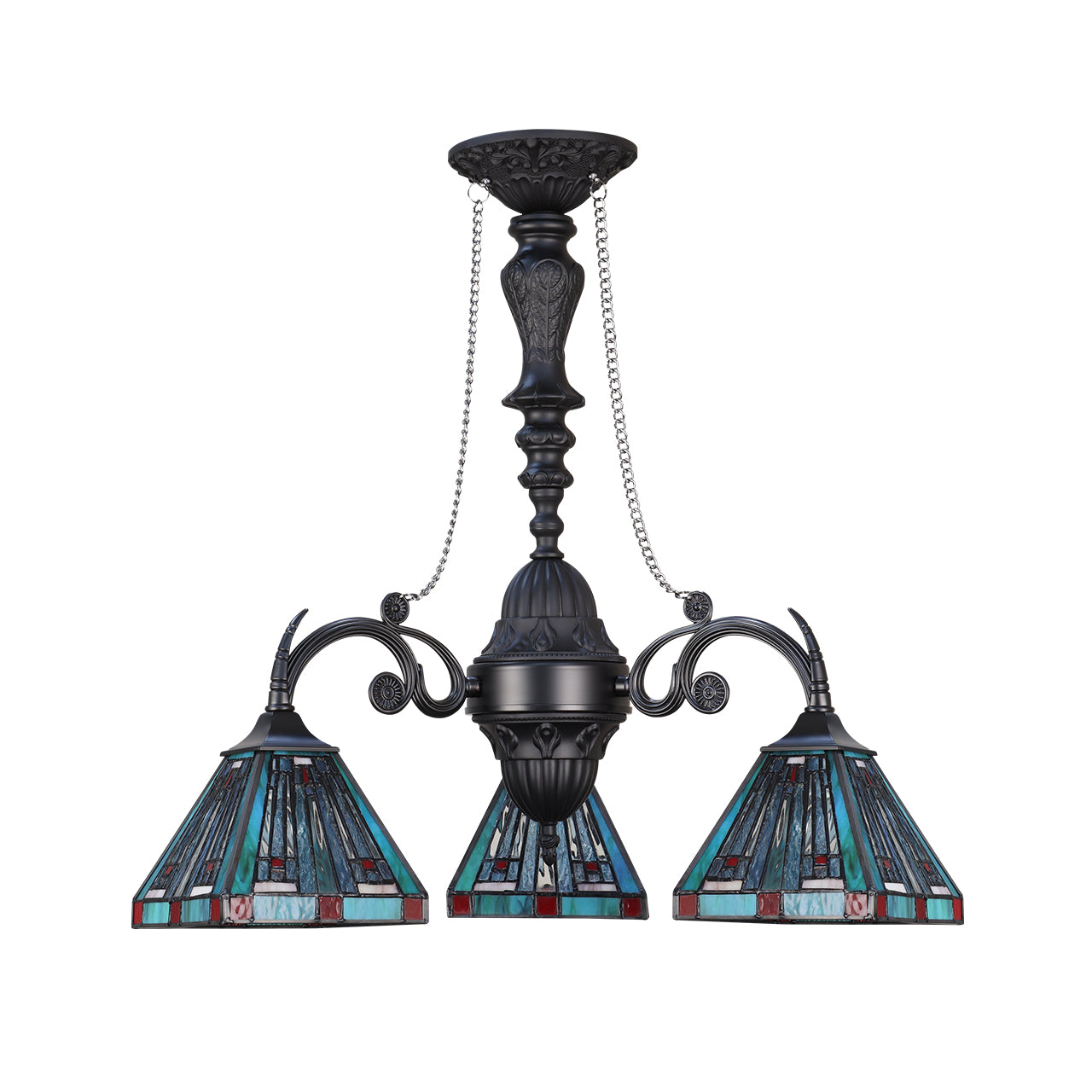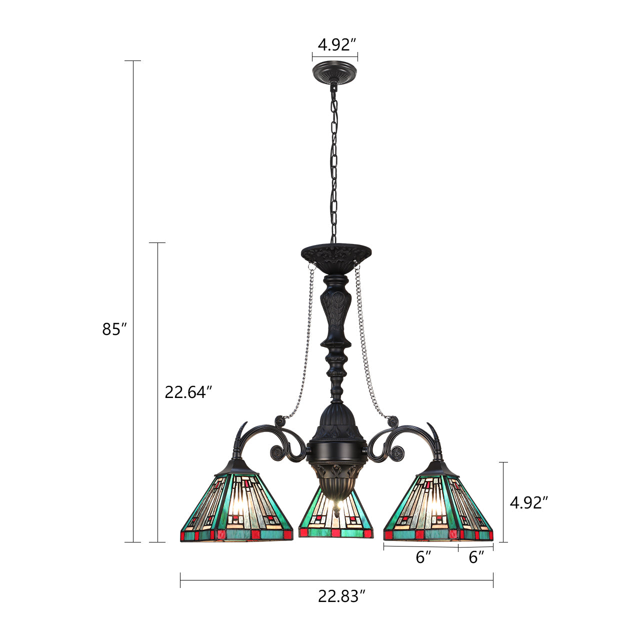 Innes is a gorgeous Mission-style 3 light mini chandelier, featuring stained glass that will cast a warm glow on your home. All of the shades are made up of 456 pieces of copper-foiled, stained art glass, expertly designed and crafted by hand. CHLOE's Tiffany-style stained glass products are formed using the very same technique developed by Louis Comfort Tiffany in the early 1900s, using hand-cut stained art glass, each wrapped in fine copper foil and soldered together at extremely high temperatures to form each unique piece. The exact size to the nearest inch may vary, and the exact color of each glass piece may vary due to each piece being handcrafted. The first image is with the light shining through, the second image is with no light. Dry-listed and recommended for an indoor setting.