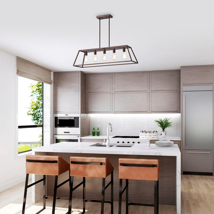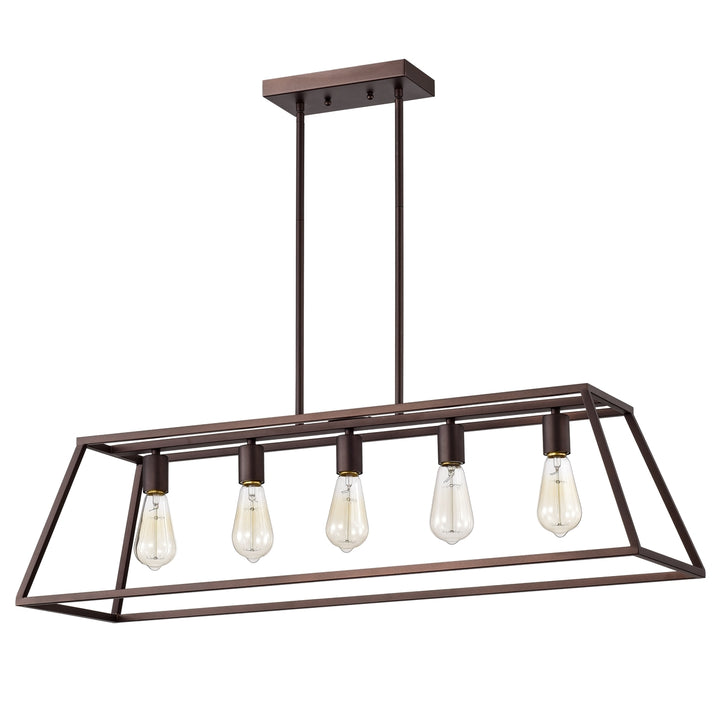 Ironclad, an industrial style 5 light ceiling pendant features an oil rubbed bronze finish that will complement many industrial decors. The trapezoid shaped frame provides uninterrupted light to any space. This piece would look great in the diningroom, gameroom and bar area. This fixture is downlight direction, and takes five 100W E26 bulb, and is compatible with fluorescent, incandescent, and LED bulbs. UL Listed, Dry listed and recommended for an indoor setting only. Can be installed on a sloped ceiling.