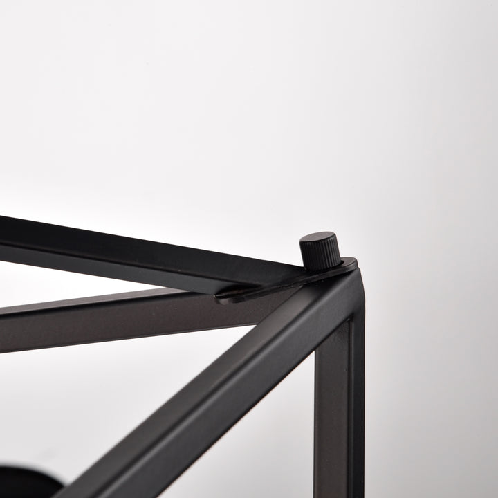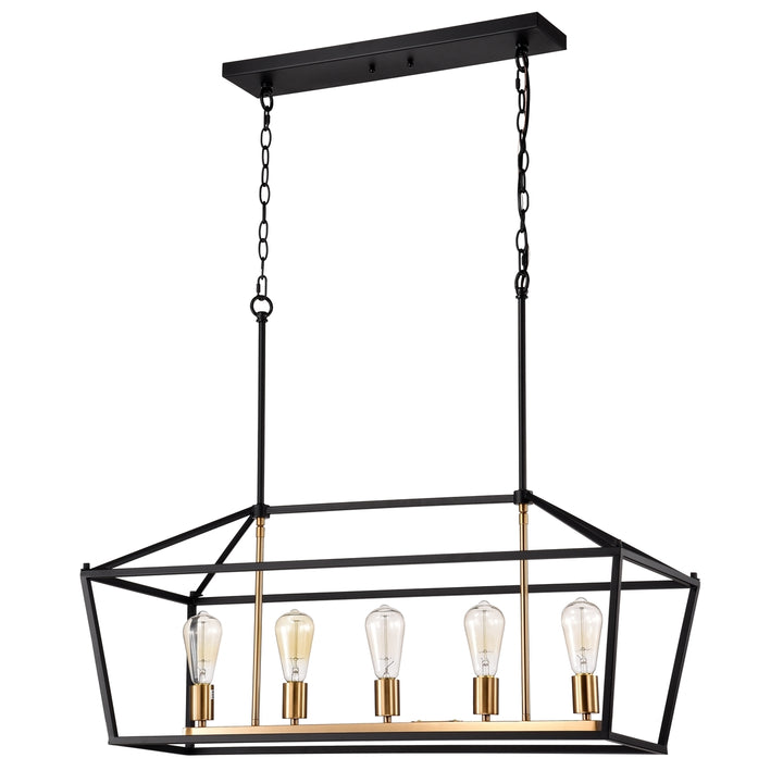 Ironclad, an industrial style 5 light ceiling pendant features a textured black finish that will complement many industrial decors. The pentagonal prism shaped frame provides uninterrupted light to any space. This piece would look great in the diningroom, gameroom and bar area. This fixture is uplight direction, and takes five 100W E26 bulb, and is compatible with fluorescent, incandescent, and LED bulbs. UL Listed, Dry listed and recommended for an indoor setting only. Can be installed on a sloped ceiling.