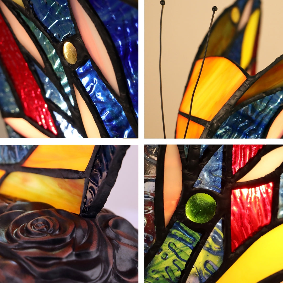 This is a butterfly-design 1-light Tiffany-style table lamp that would be a perfect fit in a bedroom, office, and living room! The shade is hand-crafted, using the same methods developed by Louis Comfort Tiffany in the early 1900s. This process entails using 69 hand-cut stained art glass pieces and 9 glass beads, each wrapped in fine copper foil and soldered together at extremely high temperatures to form each unique piece. The exact size to the nearest inch may vary, and the exact color of each glass piece may vary due to each piece being hand-crafted. The first image is with the light shining through, the second image is with no light. Dry-listed and recommended for an indoor setting.