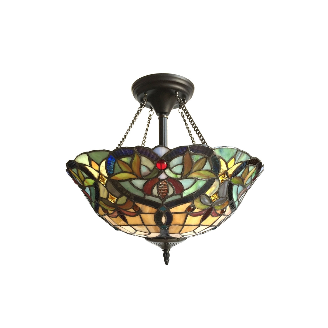 BERTRAM, a Victorian semi-flush pendant, has the style and colors to enhance any decor. Expertly handcrafted with top quality materials, including real stained glass, gem-like cabochons, and sparkling crystals. It is finished in an antique bronze patina.