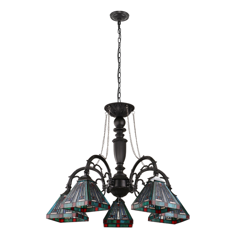 Innes is a stunning 5 light down hanging chandelier, featuring beautiful mission shades. This piece would be perfect in a livingroom or in a den. Each shade is handcrafted, using the same methods developed by Louis Comfort Tiffany in the early 1900's. This process entails using 232 hand cut stained art glass pieces per shade, each wrapped in fine copper foil and soldered together at extremely high temperatures to form each unique piece. Exact size to the nearest inch may vary, and exact color of each glass piece may vary due to each piece being handcrafted. First image is with the light shining through, second image is with no light. Dry listed and recommended for an indoor setting.
