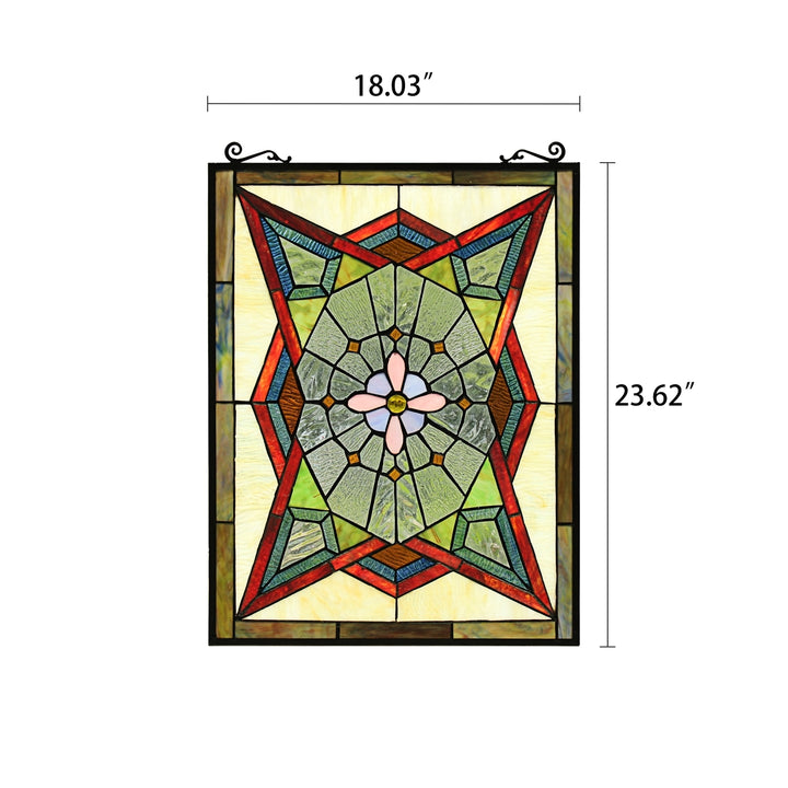 Eminent is a stunning Geometric style tiffany-glass window panel, featuring beautiful reds, blues, and a pink and purple flower design in the middle. This Tiffany panel is made up of over 130 pieces of hand cut, stained art glass and 1 glass bead, expertly pieced and soldered together, to create each panel. Each of CHLOE's Tiffany-style stained glass panels are formed using the very same techninique developed by Louis Comfort Tiffany in the early 1900's, using hand cut stained art glass, each wrapped in fine copper foil and soldered together at extremely high temperatures to form each unique panels. This panel would look great in the livingroom, kitchen, dining room and bedroom windows. Exact size to the nearest inch may vary, and exact color of each glass piece may vary due to each piece being hand crafted. First image is with the light shining through, second image is with no light. Dry listed and recommended for an indoor setting only. This panel comes with a 31.5" hanging chain.