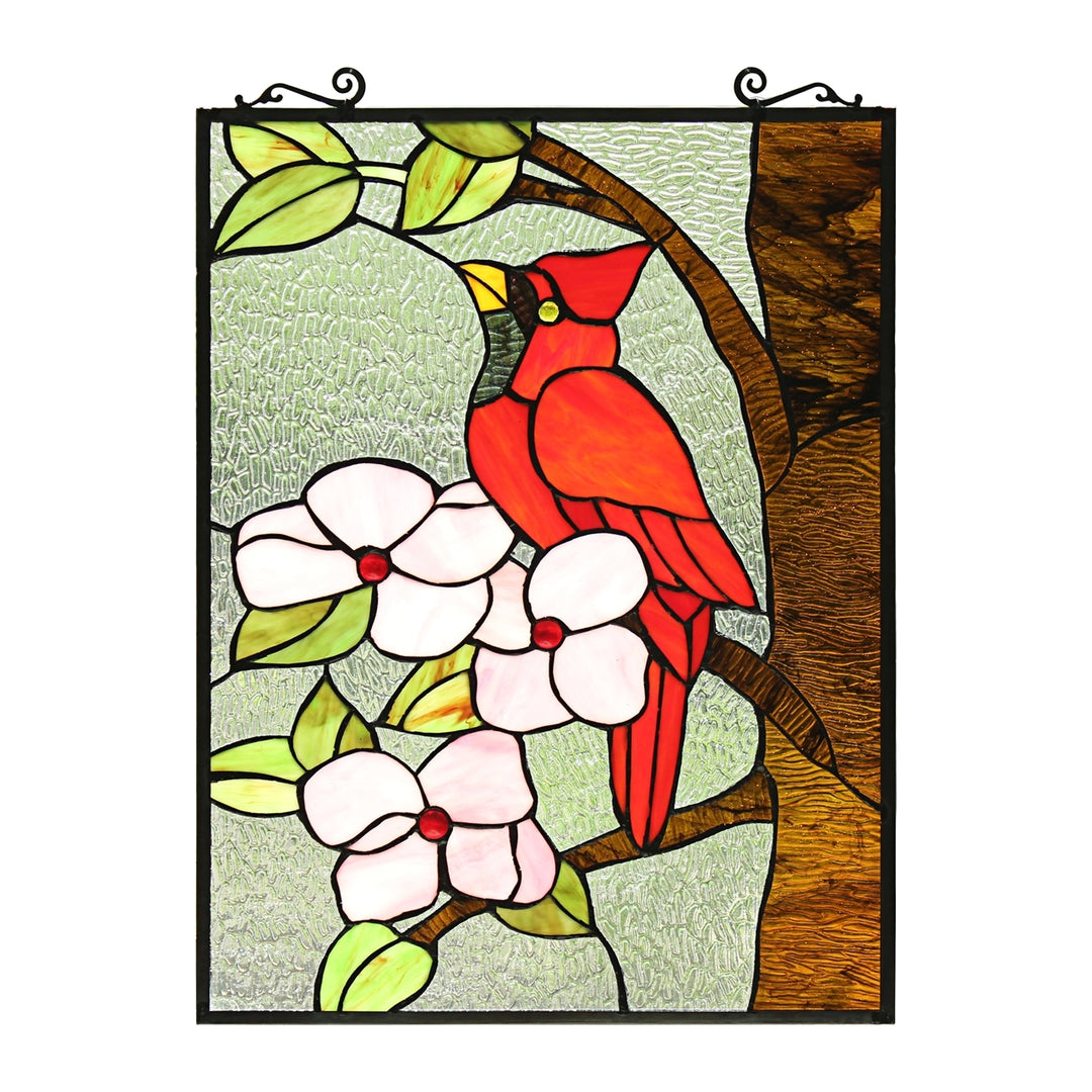 Hibiscus Cardinal, featuring a bright red northern cardinal sitting on a branch from a hibiscus tree, is a gorgeously designed tiffany-style stained glass window panel. The hand crafted Tiffany panel is made up of over 65 pieces of hand cut, stained art glass and 4 glass beads, expertly pieced and soldered together, to create each panel. Each of CHLOE's Tiffany-style stained glass panels are formed using the very same techninique developed by Louis Comfort Tiffany in the early 1900's, using hand cut stained art glass, each wrapped in fine copper foil and soldered together at extremely high temperatures to form each unique panels. This panel would look great in the livingroom, kitchen, dining room and bedroom windows. Exact size to the nearest inch may vary, and exact color of each glass piece may vary due to each piece being hand crafted. First image is with the light shining through, second image is with no light. Dry listed and recommended for an indoor setting only. This panel comes with a 31.5" hanging chain.