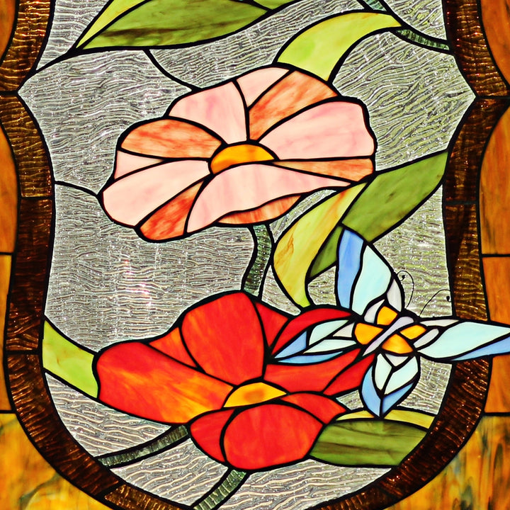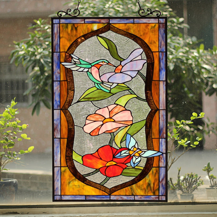 Looking for something to spice up your view in the kitchen, dining room and living room? Look no further, this stunning, animal/floral-style window panel is sure to brighten up the room with it's vibrant red, blue, and green colors on hummingbirds and poppy flowers. The hand crafted Tiffany panel is made up of 173 pieces of hand cut, stained art glass and 1 glass bead, expertly pieced and soldered together, to create each panel. Each of CHLOE's Tiffany-style stained glass panels are formed using the very same techninique developed by Louis Comfort Tiffany in the early 1900's, using hand cut stained art glass, each wrapped in fine copper foil and soldered together at extremely high temperatures to form each unique panels. Exact size to the nearest inch may vary, and exact color of each glass piece may vary due to each piece being hand crafted. First image is with the light shining through, second image is with no light. Dry listed and recommended for an indoor setting.